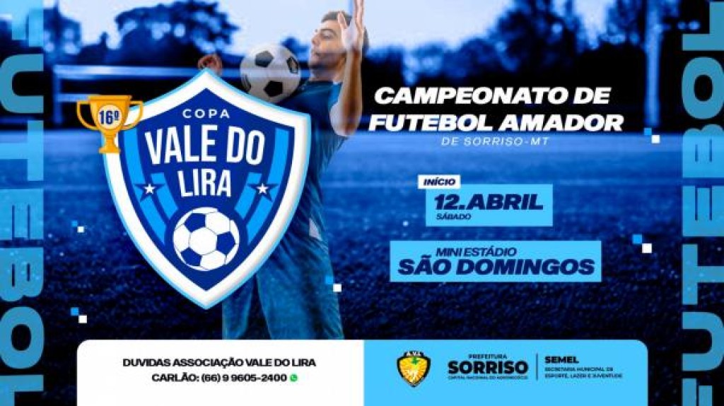 A emoção do futebol amador está de volta! A 18ª edição da Copa Vale do Lira tem início nesta sexta-feira (12), com dois jogos a partir das 17h30, no Estádio Municipal São Domingos. A competição, que já faz parte do calendário esportivo do município, é promovida pela Associação Vale do Lira, com o apoio da Prefeitura de Sorriso.