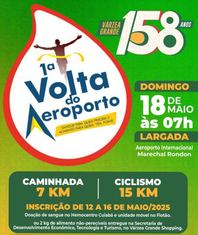 Na semana de aniversário dos 158 anos de emancipação político-administrativa de Várzea Grande, a cidade vai ganhar um evento inédito, que une solidariedade, saúde e diversão: a 1ª Volta do Aeroporto – “Sangue para quem precisa e Alimento para quem tem fome”. A ação será realizada no sábado, 18 de maio, às 7h da manhã, com largada em frente ao Aeroporto Internacional Marechal Rondon.