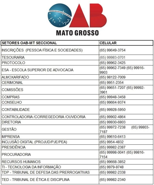 A Ordem dos Advogados do Brasil – Seccional Mato Grosso (OAB-MT) informa que, devido a problemas técnicos da operadora Vivo, os telefones fixos da Seccional