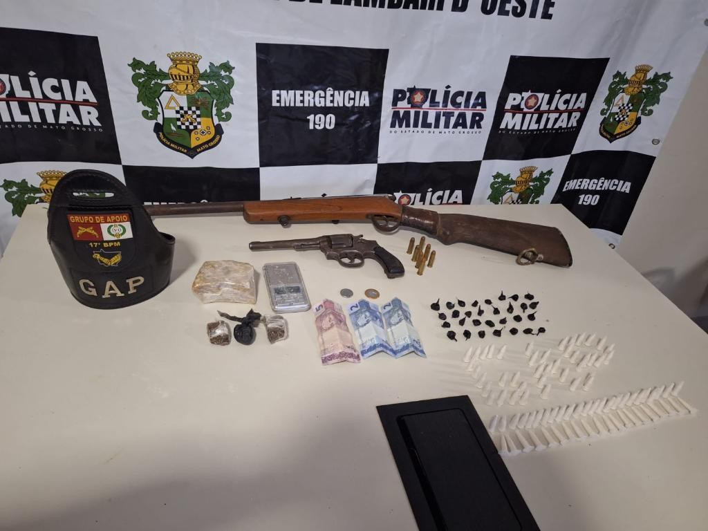 Policiais militares do 17º Batalhão prenderam um homem, por porte ilegal de arma de fogo e tráfico ilícito de drogas, nesta segunda-feira (16.2), em Lambari
