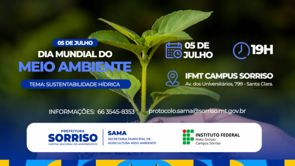 Com o foco em debater soluções ambientais sustentáveis, a Prefeitura de Sorriso e o Instituto Federal de Mato Grosso (IFMT) deram o start às ações do Dia Mundial do Meio Ambiente 2025. As inscrições já estão abertas e podem ser realizadas pelo link https://www.sympla.com.br/evento/dia-mundial-do-meio-ambiente-2025/2957145?share_id=whatsapp. A inscrição é gratuita e gera certificado digital de quatro horas. O encontro será no dia 5 de junho com credenciamento às 18h30 e palestras a partir das 19 horas no auditório do Instituto Federal de Mato Grosso (IFMT), Campus de Sorriso.