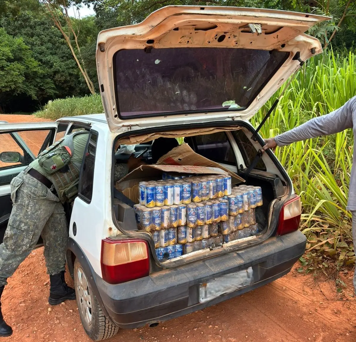 Durante a fiscalização, as equipes abordaram um veículo, onde estavam dois homens. Na vistoria, os agentes localizaram 38 caixas de cerveja, todas com embalagens sujas de terra, o que levantou suspeita quanto à procedência da mercadoria.