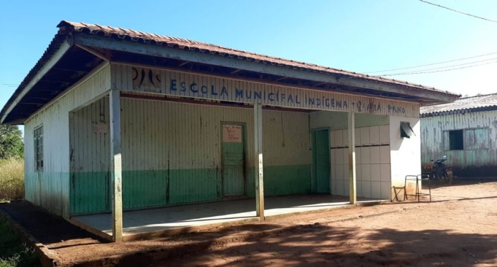 #PraTodosVerem – A imagem mostra a fachada simples de uma escola municipal indígena construída em madeira, com paredes pintadas em verde e branco. O prédio possui cobertura de telha cerâmica, varanda frontal sustentada por colunas e uma porta central de entrada. Na parte superior, há uma placa identificando o local como Escola Municipal Indígena Tupará. O ambiente ao redor é de chão batido, reforçando o caráter rural e comunitário da construção.