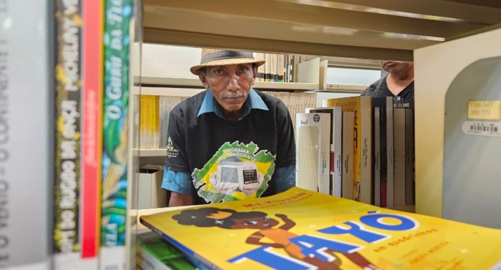 #PraTodosVerem: A imagem mostra o aluno do SoleTRE, um homem idoso, negro, usando chapéu e camiseta do programa Voto Consciente, observando atentamente prateleiras de livros em uma biblioteca. Em primeiro plano, destaca-se um livro infantil colorido. Ao final do texto, tem uma galeria com mais fotos da visita com alunos do SoleTRE.