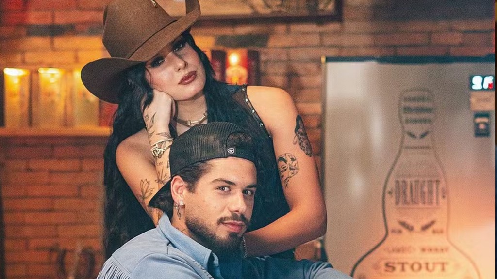 Na imagem, o sertanejo se apoia nas pernas da cantora, que está sentada em um balcão de bar, enquanto ambos olham para a câmera. “Coloca o chapéu que lá vem a pedrada”, escreveram Ana, na legenda da publicação.