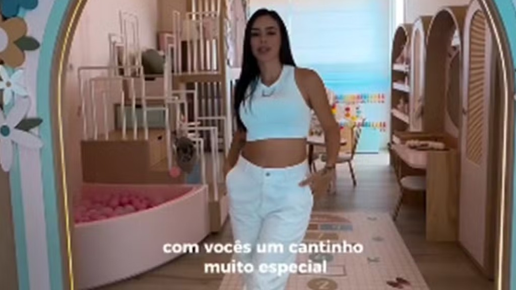 “Um cantinho muito especial aqui na casa dos meus pais que quis preparar pra Mavie, que é a brinquedoteca dela. É um cantinho dos sonhos. Quem tem criança sabe a importância de ter um espaço desse pros nosso pequenos, inspirador, criativo, seguro, que foi uma das coisas mais importantes que pedi”, começou Bruna.