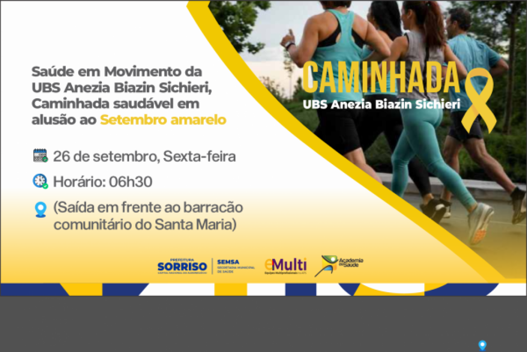 Nesta sexta-feira (26), a UBS Anezia Biazin Sichieri promove a Caminhada Saúde em Movimento, em alusão ao Setembro Amarelo, mês que chama a atenção para a valorização da vida e o cuidado com a saúde mental.