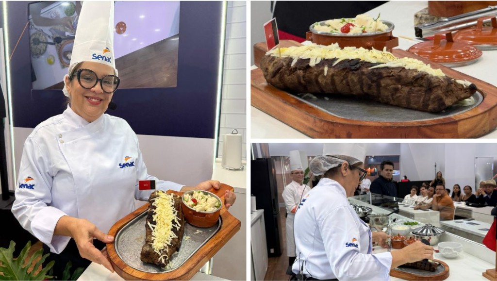 A carne de sol assada com farofa d’água, tradição de Campina Grande (PB) conquistou o público nesta sexta-feira (22) no Culinária Show do Senac, durante o Salão do Turismo. A receita combina carne de sol, preparada de forma artesanal e assada rapidamente, com a farofa d’água – leve, feita com água, cebola roxa e segredos da chef – criando um prato que remete à memória afetiva de famílias nordestinas, lembrando encontros de fim de semana e reuniões familiares.