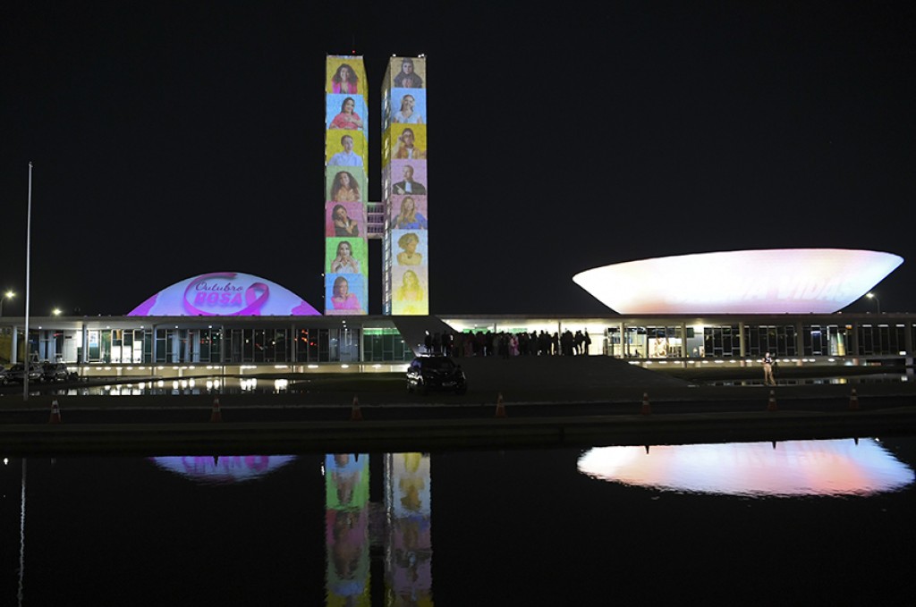 Na noite de quarta-feira (1º), o Congresso Nacional recebeu projeções em apoio à campanha Outubro Rosa. Durante algumas horas, as torres e cúpulas do Senado e da Câmara foram iluminadas com frases e imagens ressaltando a importância do diagnóstico precoce do câncer de mama.