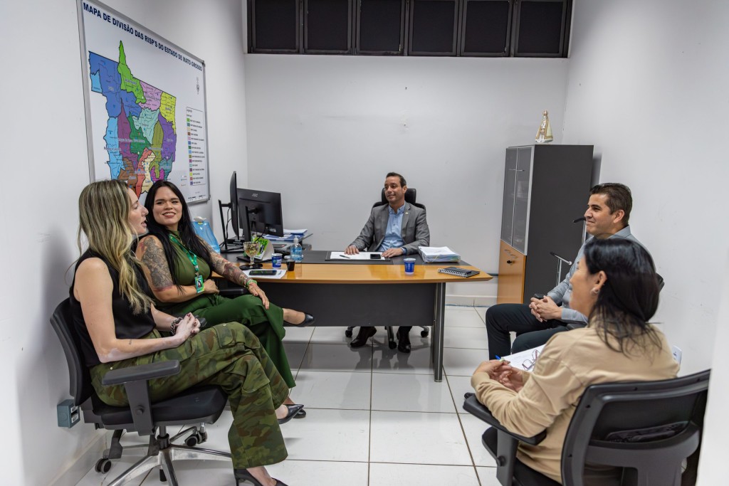 A foto foi registrada na sala do secretário de Justiça do Estado de Mato Grosso, Vitor Hugo Bruzulato Teixeira, com a presença dos demais participantes. O espaço é amplo e bem iluminado, com armário e mesa de trabalho bem distribuídos no ambiente. Na parede lateral, está exposto um mapa grande do Estado de Mato Grosso com delimitações em cores distintas.
