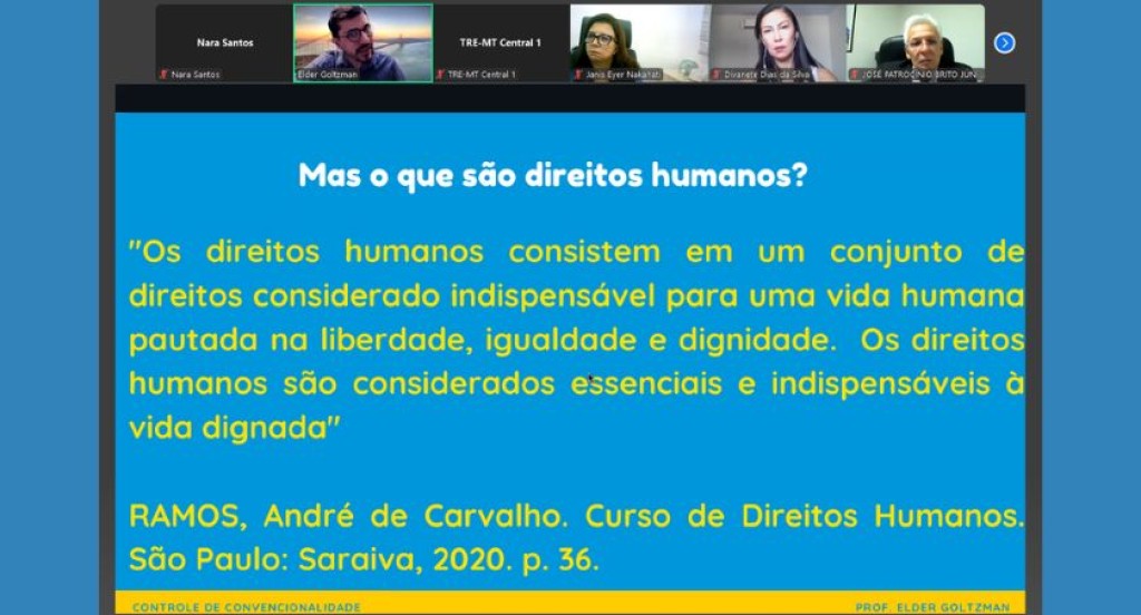 #PraTodosVerem: A imagem mostra uma aula virtual com o tema “Mas o que são direitos humanos?”, ministrada por Elder Goltzman, cujo vídeo aparece em destaque na parte superior da tela junto a outros participantes. A apresentação exibe uma citação de André de Carvalho Ramos, explicando o que são os direitos humanos. O slide tem fundo azul, com letras amarelas e brancas, e faz referência ao livro Curso de Direitos Humanos (2020). A imagem representa um momento de formação promovida pelo TRE-MT sobre o papel dos direitos humanos na Justiça Eleitoral.