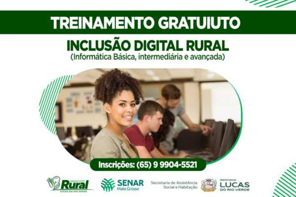 Lucas do Rio Verde recebe em outubro mais uma capacitação do programa gratuito de Inclusão Digital Rural, que busca oferecer formação em informática básica, intermediária e avançada. O treinamento é resultado de uma parceria entre o Sindicato Rural, o Serviço Nacional de Aprendizagem Rural (Senar-MT) e a Prefeitura Municipal, por meio da Secretaria de Assistência Social e Habitação.