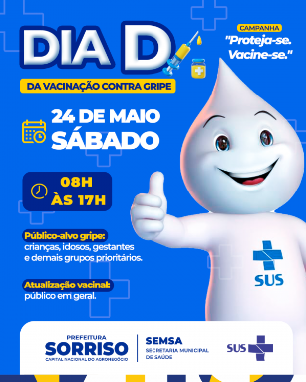 No próximo sábado, 24 de maio, 23 PSFs (Posto de Saúde da Família), estarão abertas das 8h às 17h, sem interrupção para o almoço, em função do Dia D de vacinação contra a gripe e da campanha de multivacinação. A vacina contra a gripe está disponível para crianças, idosos, gestantes e demais grupos prioritários.