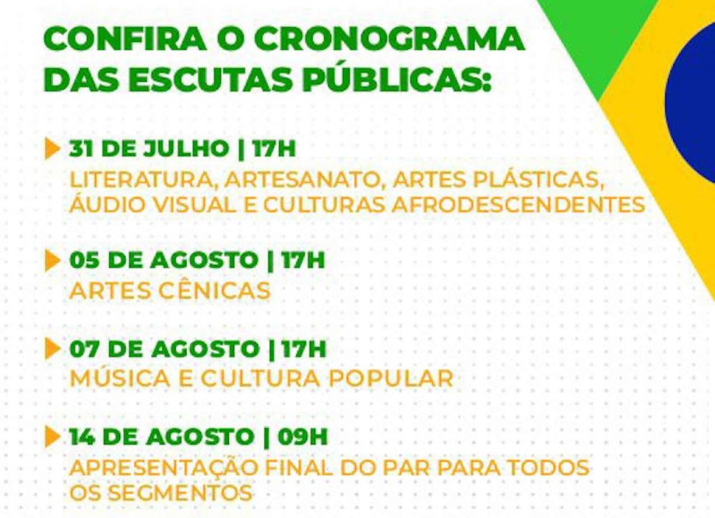 NOVAS DATAS EM AGOSTO – As propostas coletadas serão sistematizadas e incluídas no planejamento das próximas ações culturais, garantindo que a cultura siga sendo construída com quem vive e faz cultura todos os dias. Haverá também novos encontros para a Escuta Pública. Dia 5 de agosto, às 17h, para o segmento de Artes Cênicas, dia 7 de agosto, às 17h, para música & cultura popular e dia 14 de agosto, às 9h, com a apresentação final do PAR para todos os segmentos, todos a serem realizados no Centro Cultural Orla da Alameda.