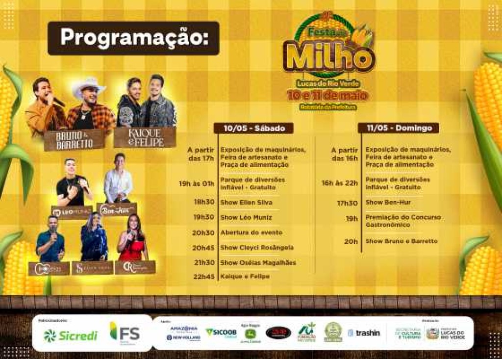 A 4ª edição da Festa do Milho será realizada neste final de semana, nos dias 10 e 11 de maio, na rotatória do Paço Municipal de Lucas do Rio Verde. O evento, que já se tornou tradição no município, promete reunir famílias luverdenses com uma programação repleta de atrações gratuitas.
