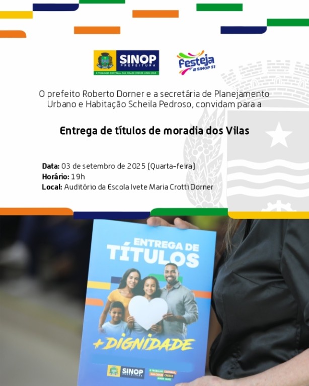 Nesta quarta-feira, três de setembro, às 19h, a Prefeitura de Sinop realiza na Escola Municipal de Educação Básica de Tempo Integral Ivete Maria Crotti Dorner, a entrega de 130 escrituras gratuitas, aos moradores do Residencial Vila Santana II e mais 224 títulos, em segunda chamada, dos Vilas Santana I, América, Mariana e Lobos I e II. A entrega faz parte de um projeto desenvolvido pela Secretaria de Planejamento Urbano e Habitação, que contempla os moradores com a  isenção do pagamento do Imposto sobre Transmissão de Bens Imóveis (ITBI).