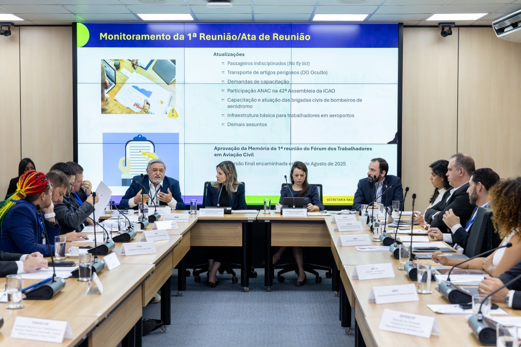 A segunda reunião do Fórum Permanente para Discussão de Políticas Públicas para os Trabalhadores da Aviação Civil promoveu debate sobre as condições operacionais e a aplicação de ferramentas que favoreçam a capacitação profissional no setor aeroportuário. O encontro, realizado nesta terça (19), na sede do Ministério de Portos e Aeroportos, foi capitaneado pela Secretaria Nacional de Aviação Civil (SAC) e contou com a presença de representante da Infraero, Agência Nacional de Aviação Civil (Anac), empresas aéreas, concessionárias, sindicatos e federações de trabalhadores.