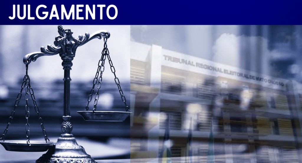 #DescriçãodaImagem: Imagem com fundo em tons de azul. À esquerda, há uma balança da Justiça em destaque. À direita, aparece a fachada do prédio do Tribunal Regional Eleitoral de Mato Grosso, com efeito de transparência. Na parte superior, uma faixa azul com a palavra “JULGAMENTO” em letras brancas e caixa alta. O layout transmite formalidade e institucionalidade.