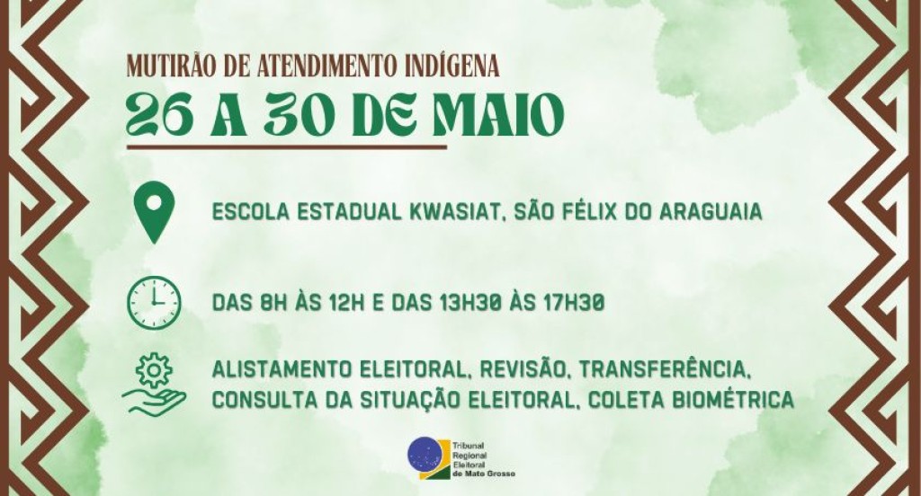A Justiça Eleitoral de Mato Grosso fará um mutirão de atendimento na Aldeia Capivara, localizada no município de São Félix do Araguaia e dentro do Parque Indígena do Xingu. A ação está programada para os dias 26 a 30 de maio, na Escola Estadual Kwasiat, das 8h às 12h e das 13h30 às 17h30. Essa é mais uma ação que demonstra o compromisso do Tribunal Regional Eleitoral de Mato Grosso (TRE-MT) com a inclusão e com a acessibilidade cidadã.