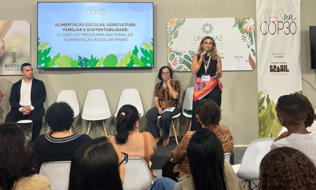 No debate sobre “Alimentação escolar, agricultura familiar e sustentabilidade” – realizado na 30ª Conferência das Nações Unidas sobre Mudanças Climáticas (COP30), nesta quarta-feira, 12 de novembro, em Belém, no Pará –, o Ministério da Educação (MEC) apresentou o Programa Nacional de Alimentação Escolar (Pnae). Criado há 70 anos, o programa garante mais de 50 milhões de refeições todos os dias para quase 40 milhões de estudantes da rede pública de educação básica, em cerca de 150 mil escolas de todo o Brasil. São R$ 5,5 bilhões investidos por ano para assegurar o direito à alimentação adequada e saudável, como previsto na Constituição Federal de 1988.