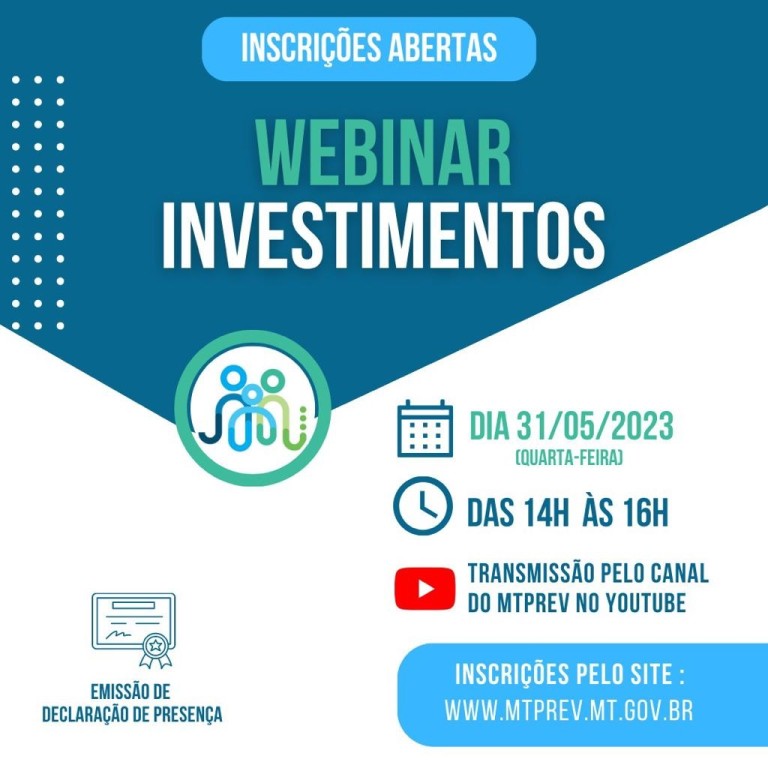 No próximo dia 31 de maio o MTPrev, Regime de Previdência dos servidores efetivos do Estado de Mato Grosso, promoverá, das 14h às 16h (horário de Cuiabá) um webinar sobre a gestão de ativos do Regime Próprio de Previdência Social (RPPS) e a atuação e competências do Comitê de Investimentos do MTPrev. O evento, realizado pelo canal do MTPrev no Youtube é importante para os servidores do Poder Judiciário, considerando o processo de transição para a integração entre os poderes quanto à gestão das previdências.As inscrições para participar do webinar estão abertas. Clique neste link para se inscrever.