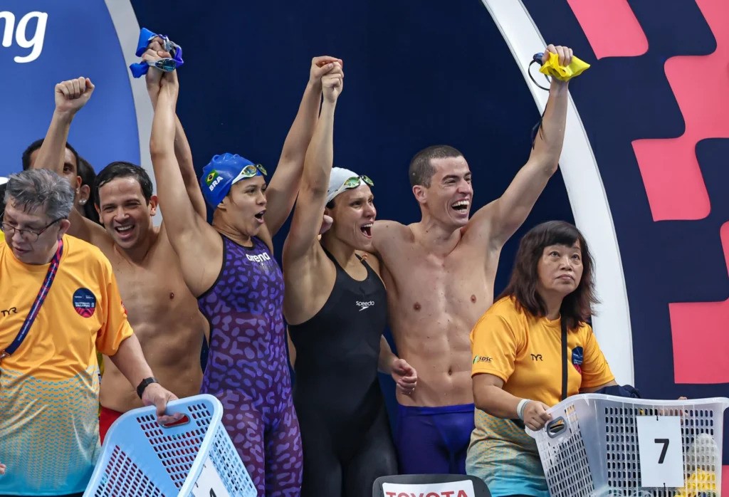O Brasil subiu mais seis vezes ao pódio do Mundial de natação paralímpica em Singapura nesta quarta-feira (24) com duas medalhas de ouro, três de prata e uma de bronze. O dia que marca a metade da competição, que ocorre de 21 a 27 de setembro, registrou o segundo título do mineiro Gabriel Araújo com quase nove segundos de vantagem em relação ao segundo colocado e um recorde mundial da equipe mista de revezamento 4x100m livre 49 pontos (para atletas com deficiência visual).