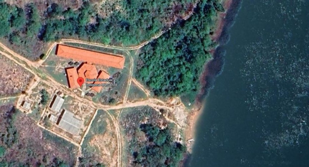 #PraTodosVerem: A imagem mostra uma vista aérea da Escola Estadual Indígena Metuktire, localizada próxima às margens do rio Xingu, rodeada por áreas de mata e alguns espaços abertos. É possível ver construções com telhados de cor avermelhada e estradas de terra que dão acesso ao local.