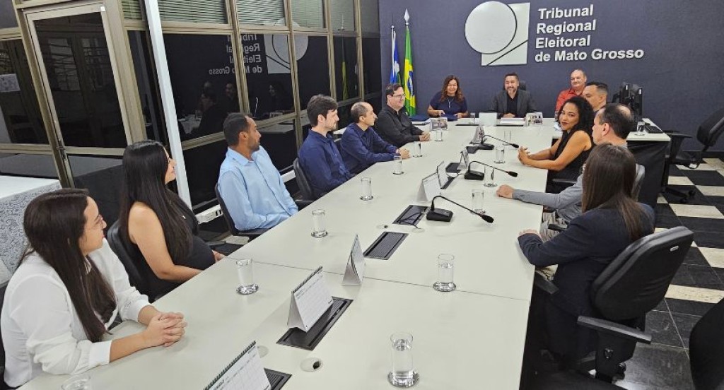 #PraTodosVerem: A imagem mostra uma reunião formal na sede do TRE-MT. Dez pessoas estão sentadas ao redor de uma mesa de reuniões, enquanto outros três integrantes da instituição acompanham a cerimônia. Ao fundo, aparecem as bandeiras do Brasil e de Mato Grosso, além do logotipo do TRE-MT na parede. Trata-se de um momento oficial, ligado à posse de novos servidores. Ao final da matéria, tem uma galeria com mais fotos do evento.