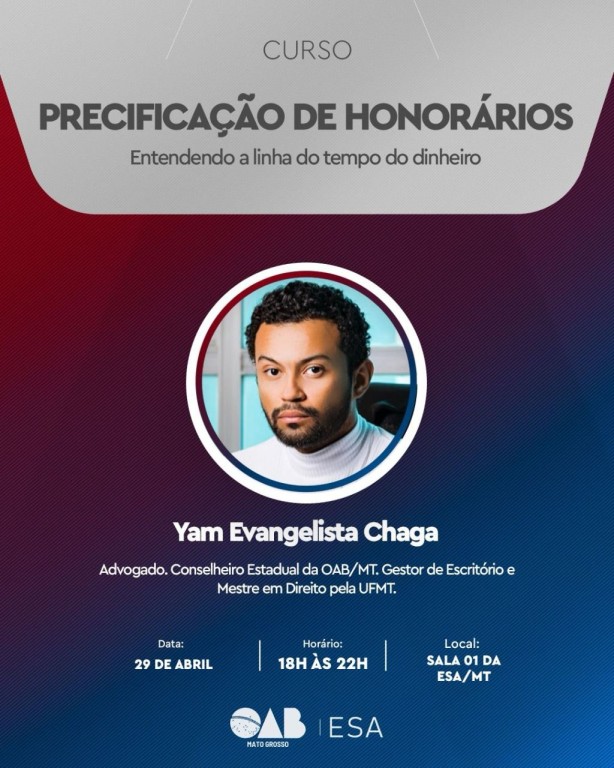 A Ordem dos Advogados do Brasil – Seccional Mato Grosso (OAB-MT) oferece nesta terça-feira (29), através da Escola Superior da Advocacia (ESA-MT), o curso Precificação de Honorários – Entendendo a Linha do Tempo do Dinheiro, que será ministrado pelo advogado Yam Evangelista, conselheiro seccional da OAB-MT e gestor de escritório. O curso começa logo mais às 18h, no auditório da ESA-MT, em Cuiabá.