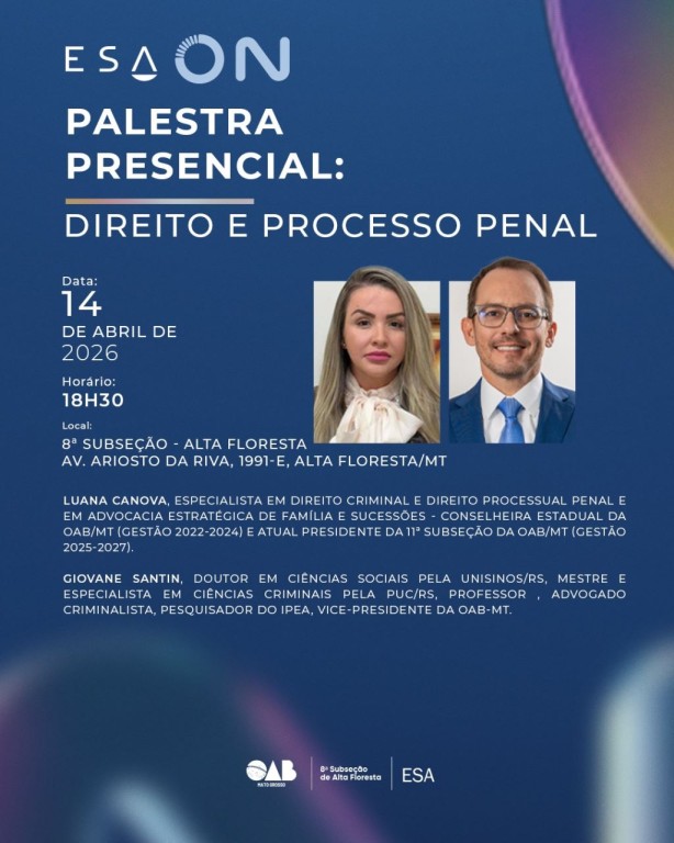 A Ordem dos Advogados do Brasil – Seccional Mato Grosso (OAB-MT), por meio da sua 8ª Subseção e da Escola Superior da Advocacia (ESA-MT), realiza em Alta Floresta a palestra Direito e Processo Penal, dia 14 de abril. A palestra será ministrada pelos advogados criminalistas, Giovane Santin e Luana Canova. De acordo com o vice-presidente da OAB-MT, Giovane Santin, o evento visa promover a capacitação de advogados e advogadas para que atuem com mais segurança na advocacia criminal. “Vamos abordar novidades legislativas e práticas. Apresentar exemplos concretos, relatar experiências, compartilhar informações atuais e tirar dúvidas”.