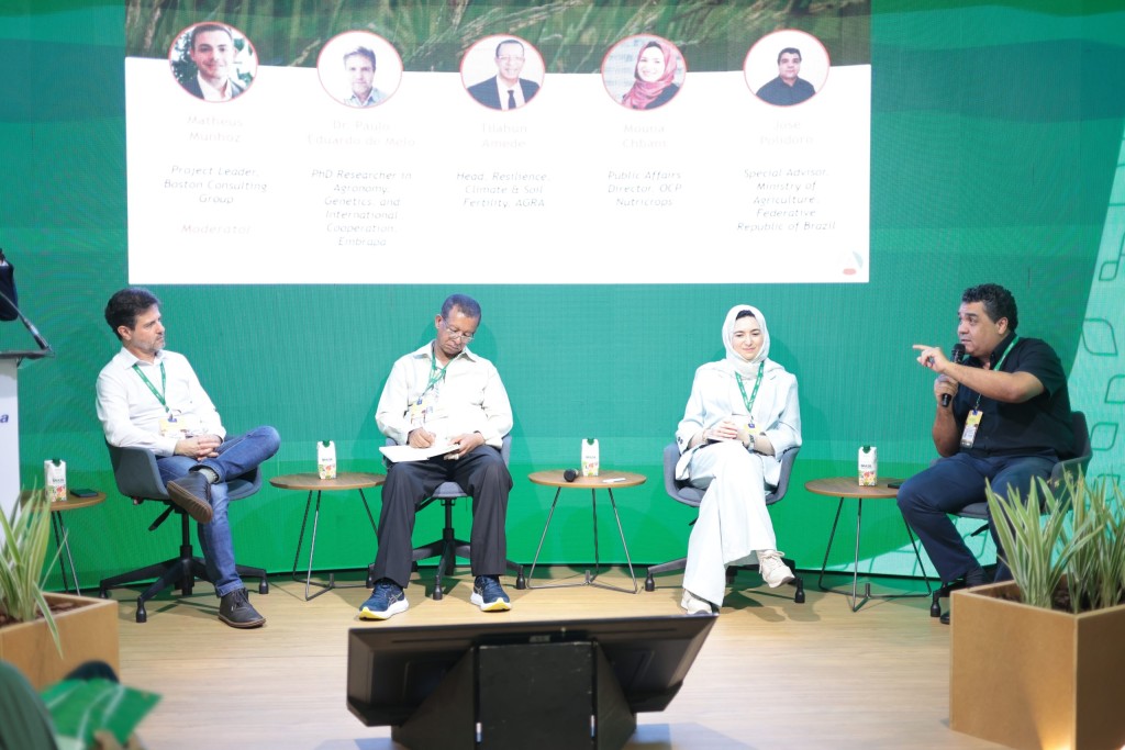 Participaram do painel o pesquisador PhD em Agronomia, Genética e Cooperação Internacional da Embrapa, Paulo Melo; o chefe de Resiliência, Clima e Fertilidade do Solo da Aliança para uma Revolução Verde na África (AGRA), Tilahun Amede; e a diretora de Relações Públicas da OCP Nutricrops, Mouna Chbani.