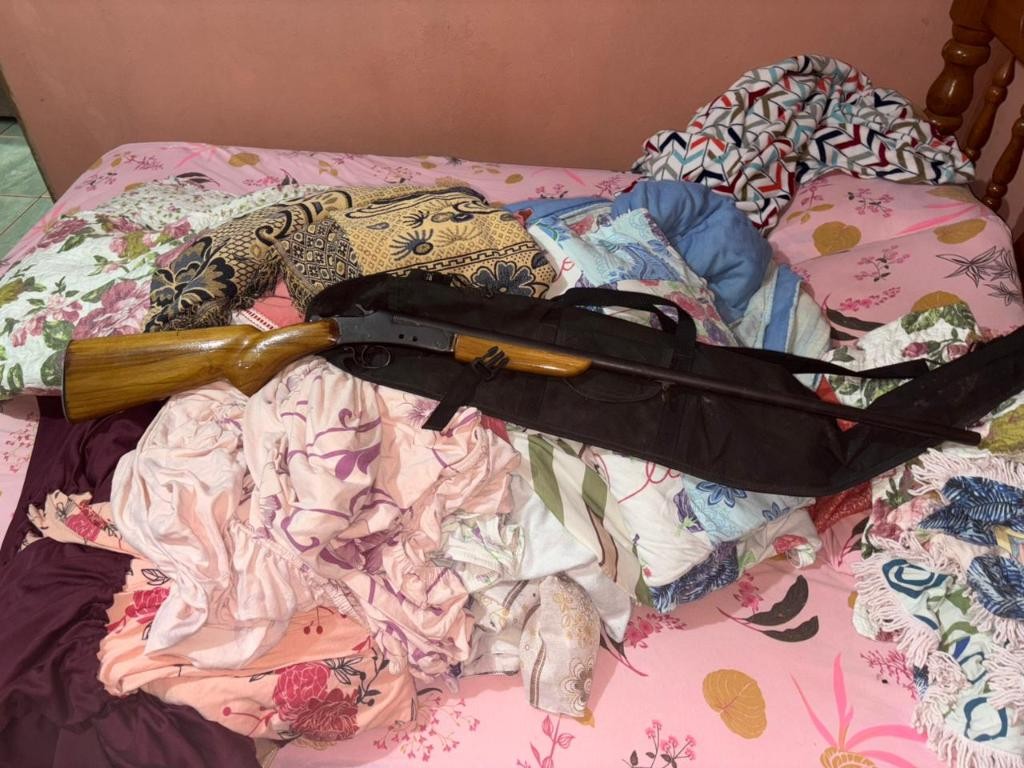 Durante o cumprimento das ordens judiciais na casa do investigado, na casa da mãe dele e no sítio da família, os policiais apreenderam dois aparelhos celulares e uma espingarda calibre 28 sem registro, localizada na propriedade rural da família.