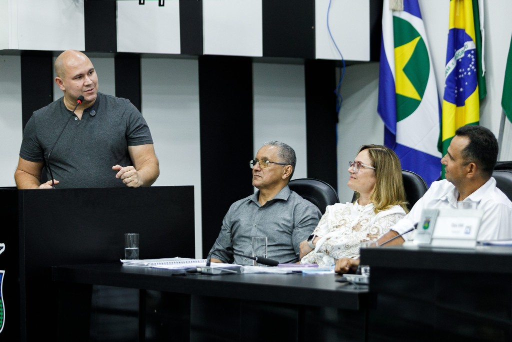 Na imagem principal o prefeito Abilio Brunini, que está vestindo sua tradicional camiseta cinza, é retratado na tribuna da Câmara de Vereadores esclarecendo pontos sobre a questão da regularização fundiária. Ele discursa de pé, ao seu lado esquerdo estão os demais membros que participaram a mesa que conduziu a audiência pública.
