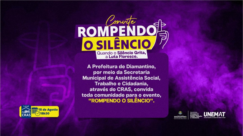 Em alusão a campanha Agosto Lilás, mês dedicado à conscientização e ao combate à violência contra a mulher, a Prefeitura de Diamantino, por meio da Secretaria Municipal de Assistência Social, Trabalho e Cidadania, através do Centro de Referência da Assistência Social (CRAS), realiza no dia 18 de agosto (segunda-feira), às 18h30, o evento “Rompendo o Silêncio – Quando o silêncio grita, a luta floresce”.