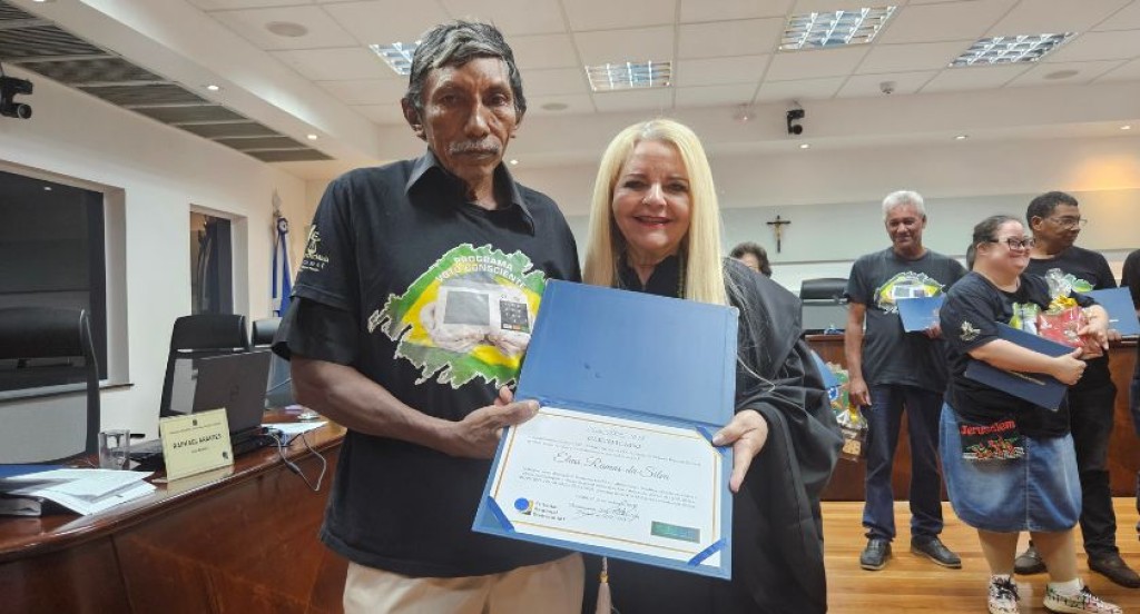 A magistrada entregou o certificado à primeira homenageada. “Já me sinto com quase 100 anos, mexendo com os alunos, sonho com eles, já aprovei cerca de 200 alunos, desde o início do projeto. Acho lindo, por isso eu gosto de dar aula mais para eles (adultos e idosos) do que para os pequenos. Quero parabenizar a senhora (desembargadora) pelo projeto, porque os alunos sabendo ler e escrever eles se tornam cidadãos. Estou muito feliz em estar aqui, obrigada”, disse a primeira homenageada que é mãe do ex-juiz-membro do TRE/MT, Eustáquio Noronha Neto, ex-diretor da Escola Judiciária Eleitoral de Mato Grosso (EJE-MT).