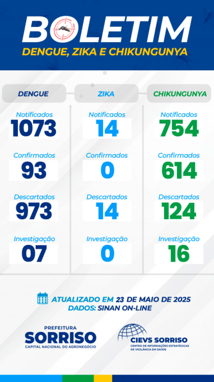 Levantamento da Secretaria Municipal de Saúde, por meio do Centro de Informações Estratégicas de Vigilância em Saúde (Cievs), aponta que, de janeiro até o dia 20 de maio, deste ano, o número de casos de arboviroses como dengue, chikungunya e zika vírus. A dengue, por exemplo, foi registrada uma diminuição nos casos. Os números constam no Sinam Oon-line.