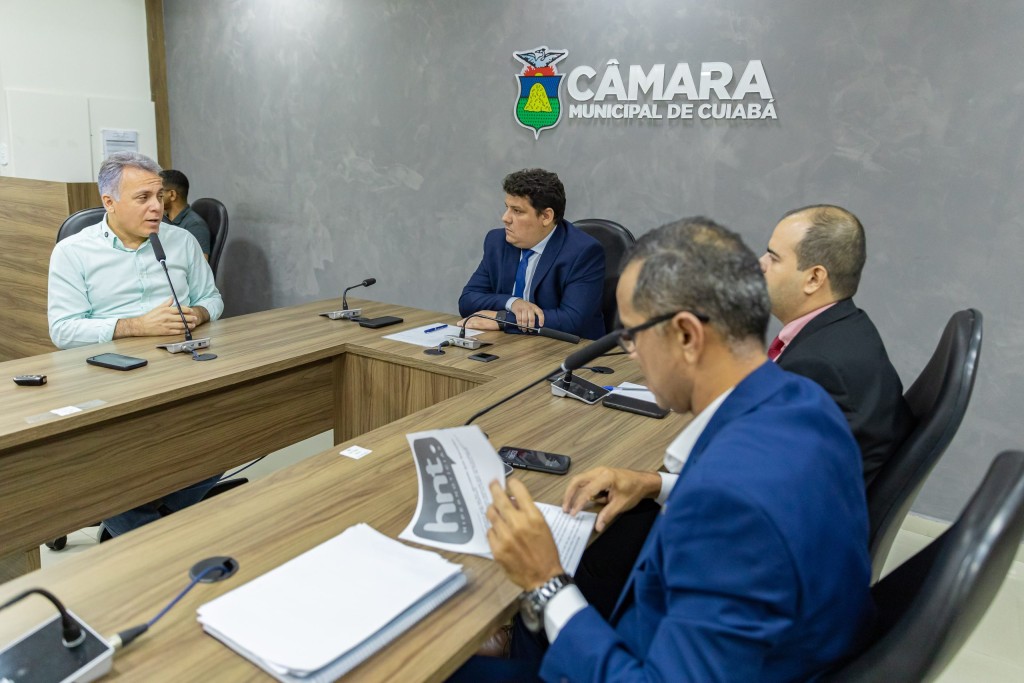 A imagem mostra o secretário de Infraestrutura e Obras, Reginaldo Teixeira, ao lado do vereador e presidente da Comissão de Obras Públicas, Alex Rodrigues. Também estão presentes os vereadores Ilde Taques e Dídimo Vovô. Eles participam de uma sessão da Comissão de Obras Públicas na Câmara Municipal de Cuiabá.