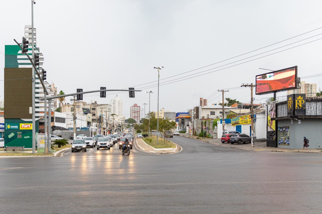 A foto mostra o acesso da Avenida Mato Grosso, visto da Avenida do CPA. No momento registrado, uma das vias da Avenida Mato Grosso está com vários veículos aguardando no semáforo.