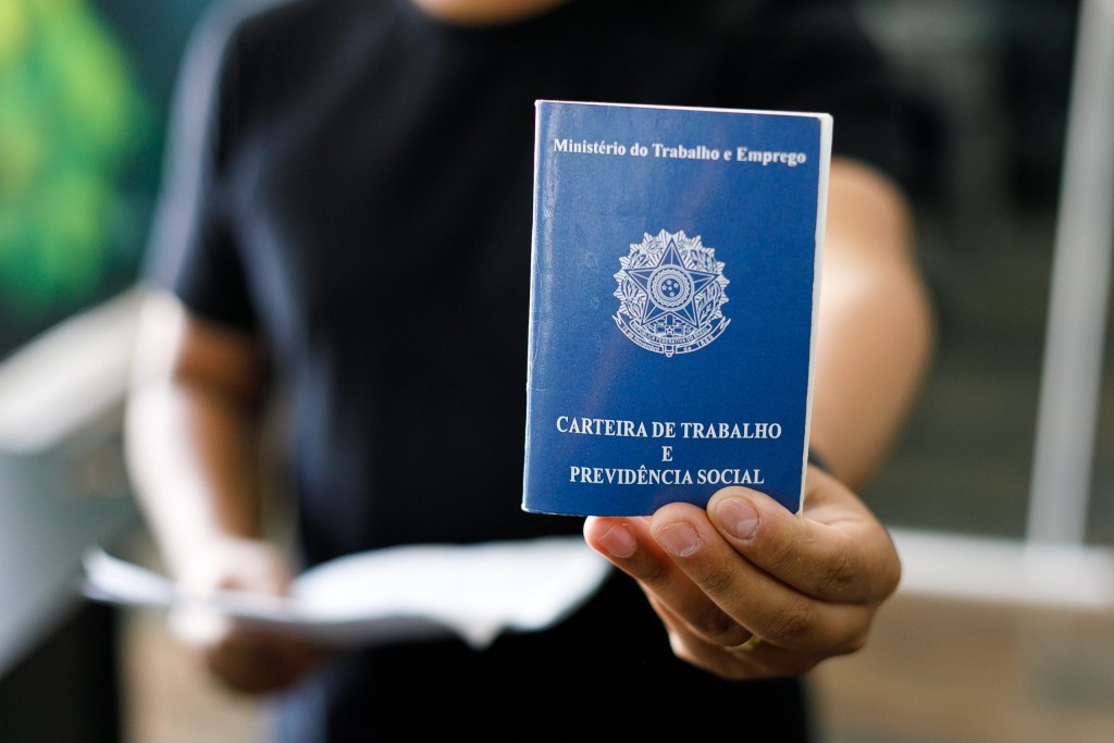 A imagem que acompanha a matéria mostra uma pessoa de camiseta preta segurando uma Carteira de Trabalho de capa azul.