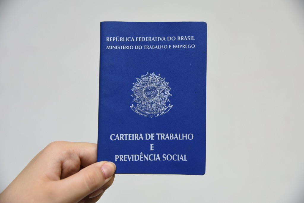 A foto mostra uma carteira de Trabalho e Previdência Social padrão, sendo na cor azul com o brasão e com o Brasão da República Federativa do Brasil. O documento é essencial para o trabalhador.