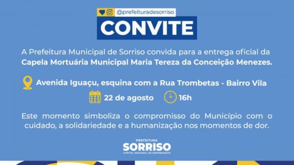 A Prefeitura de Sorriso irá inaugurar, nesta semana, duas capelas mortuárias que somam um investimento de aproximadamente R$ 1 milhão. Os novos espaços atenderão famílias tanto na sede do município quanto no interior.