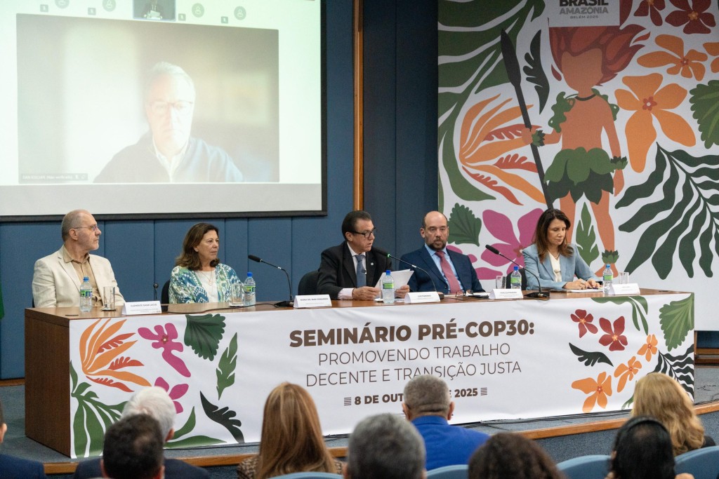 O ministro do Trabalho e Emprego, Luiz Marinho, participou, nesta quarta-feira (8), da abertura do Seminário Pré-COP30: Promovendo Trabalho Decente e Transição Justa, realizado no auditório do Instituto Rio Branco, em Brasília (DF). O evento, promovido pelo Ministério do Trabalho e Emprego (MTE) em parceria com a Organização Internacional do Trabalho (OIT), reuniu representantes do governo, de organismos internacionais e de entidades sindicais e empresariais. Participaram da mesa de abertura o diretor da OIT no Brasil, Vinicius Carvalho Pinheiro; a embaixadora da Espanha no Brasil, Pilar Fernández-Palacios; o enviado especial da Presidência da COP30 para os sindicatos, Clemente Ganz Lúcio; a diretora-executiva da COP30, Ana Toni; e o campeão climático de Alto Nível da COP30, Dan Ioschpe.