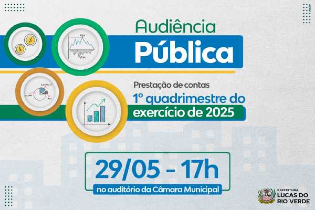 Em conformidade com a Lei de Responsabilidade Fiscal nº 101/2000, a Prefeitura de Lucas do Rio Verde, por meio da Secretaria de Desenvolvimento Econômico, Planejamento e Cidade, realizará uma audiência pública para a prestação de contas do 1º quadrimestre do exercício de 2025. O evento será no dia 29 de maio, no auditório da Câmara de Vereadores, com início às 17h, e transmitida, de forma on-line, através do canal do Legislativo Municipal no youtube.