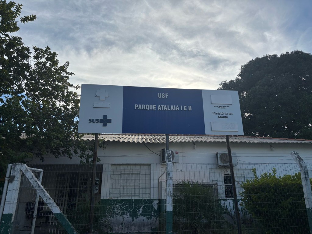 A imagem mostra a fachada da Unidade Básica de Saúde do Parque Atalaia, onde acontecerá o evento voltado para as gestantes. O letreiro tem as cores branca e azul, e o prédio da unidade é verde e branco.