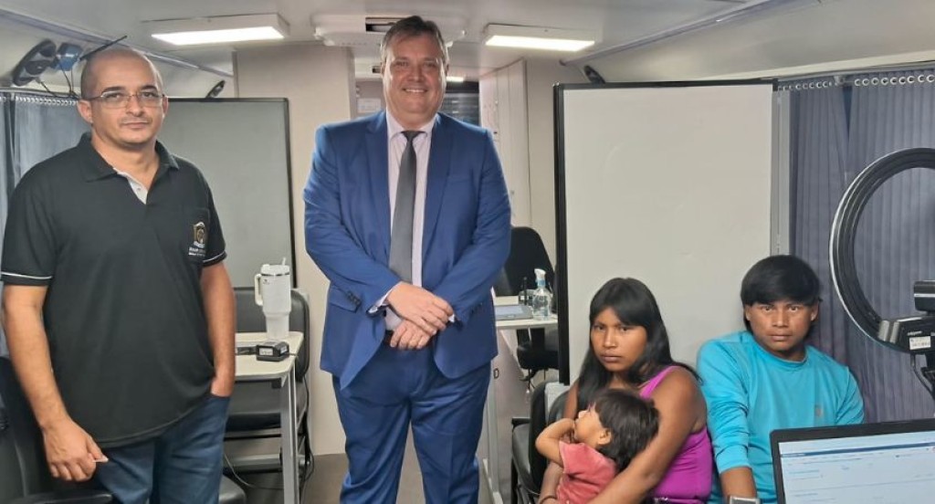 #PraTodosVerem – A imagem mostra o interior de uma unidade móvel da Justiça Eleitoral. Ao centro, o juiz eleitoral trajando terno azul posa sorridente para a foto, ao lado de um servidor com camisa preta e calça jeans. À direita, uma família indígena composta por um homem, uma mulher com uma criança no colo, está sentada, durante um atendimento. O ambiente é equipado com computadores, iluminação e divisórias, típico de um posto de cadastramento biométrico com emissão de documentos.