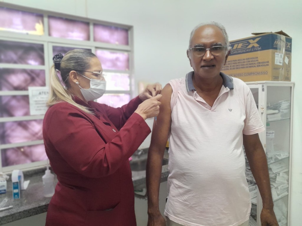 A imagem mostra um idoso durante um atendimento médico. A enfermeira veste um jaleco de tom avermelhado, e o idoso usa uma camiseta de tom claro. A enfermeira está aplicando uma vacina no paciente.